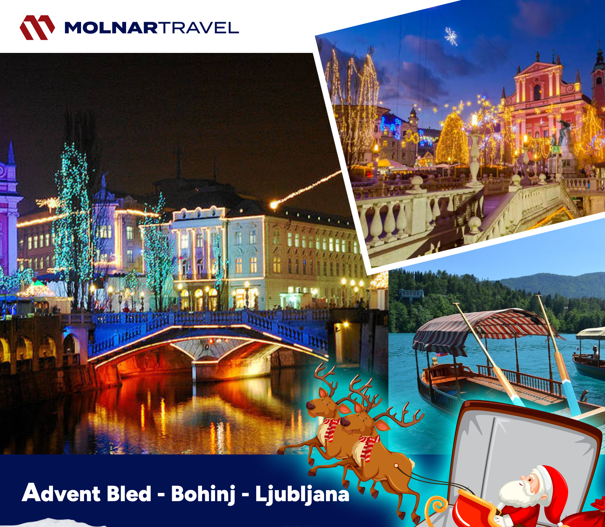 Okupljanje grupe i polazak s AK Bjelovar u 05:00 sati. Vožnja u smjeru Ljubljane i dalje prema Bledu i Bledskom jezeru, biseru Alpa, okruženom visokim planinskim vrhuncima. Slobodno vrijeme za šetnju oko jezera ili kušanje poznatih bledskih kremšnita. Moguća fakultativna vožnja tradicionalnim brodićem (pletnom) do Bledskog otoka i crkve sv. Marije s prilikom da zazvonite zvono za sreću i uživanje u božićnom ruhu ovog popularnog mjesta. U dogovoreno vrijeme nastavljamo prema Bohinju, kraći razgled i slobodno vrijeme za fotografiranje i uživanje u prirodnim ljepotama jezera. Nastavak prema Ljubljani, najzelenijoj europskoj prijestolnici, sjecištu kultura, gastro-centra središnje Europe. Po dolasku slijedi zajednička šetnja centrom Ljubljane, smještenim uz obale rijeke Ljubljanice, podno srednjovjekovnog Ljubljanskog Grada. Ljubljansko kazalište lutaka, zelena tržnica sa Plečnikovim kolonadama, katedrala Sv. Nikole i Mestne hiže (vijećnica), Robbova fontana tri rijeke, mostovi, Prešernov trg … Nakon razgleda slobodno vrijeme za šetnju okićenim gradom i vlastite aktivnosti. Polazak prema Hrvatskoj u vrijeme prema dogovoru. Očekivani povratak u kasnijim večernjim satima.