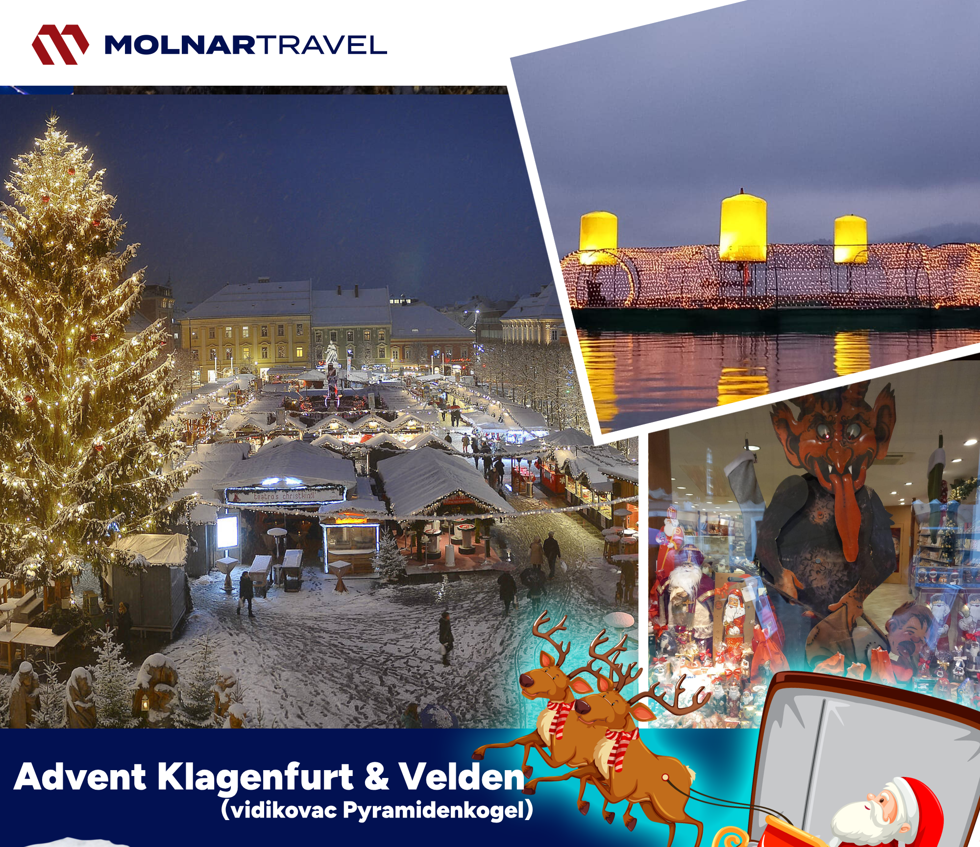 Okupljanje grupe i polazak s AK Bjelovar u 5:00 sati. Vožnja autobusom visoke turističke klase u smjeru Austrije – Klagenfurta, odnosno našeg prvog odredišta zaštitnog znaka Koruške – vidikovca PYRAMIDENKOGEL. Vidikovac Pyramidenkogel, sa svojom visinom od 100 metara na specifičan način osvjetljava adventsko nebo. Na 920 m nadmorske visine očekuje Vas jedinstveni pogled na zimski jezerski krajobraz austrijske pokrajine Koruške, a u podnožju tornja s vidikovcem ugodno ozračje adventskog sajma s izvanrednim obrtnicima i posebnim glazbenim skupinama… (Fakultativni posjet vidikovcu prema želji i ukoliko vremenske prilike to dopuste – doplata na licu mjesta)