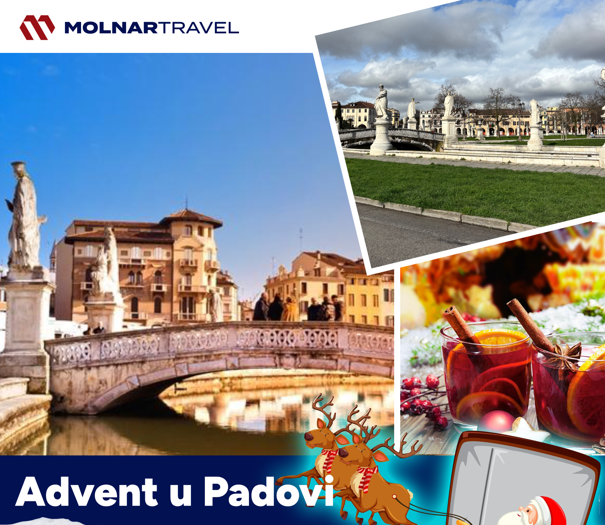 Polazak autobusa u 04:00 sata iz Bjelovara – AUTOBUSNI KOLODVOR. Zagreb u 5:00 sati kod Supernove Buzin. Karlovac Petrol u 5:30 sati. Vrata Jadrana u 7:00 sati. Upoznavanje grupe sa voditeljem putovanja. Vožnja kroz Sloveniju i Italiju uz zaustavljanje na putu. Po dolasku šetnja sa voditeljem putovanja po centru grada te slobodno vrijeme za samostalno uživanje.Za vrijeme adventa cijeli grad je ukrašen prigodnim dekoracijama i božićnim lampicama. Božićni duh osobito se primjećuje u središtu grada i oko glavnih spomenika. Osim toga, advent u Padovi karakterističan je po božićnim sajmovima na kojima sudjeluju brojni izlagači. U to doba sve zamiriše intenzivnim mirisom kolačića, a grad se oživljava veselim bojama. Od kraja studenog pa sve do početka siječnja trg Eremitani pretvara se u selo Djeda Božićnjaka. Klizalište i vrtuljak zasigurno će oduševiti i mlade i one nešto starije. Osvježenje i okrjepu potražite unutar 15-ak drvenih kućica odnosno štandova te se zasladite vrućom čokoladom, kuhanim vinom, ukusnim punčem, pečenim kobasicama i sl. Polazak prema Hrvatskoj u dogovoreno vrijeme. Dolazak u kasnim večernjim satima.