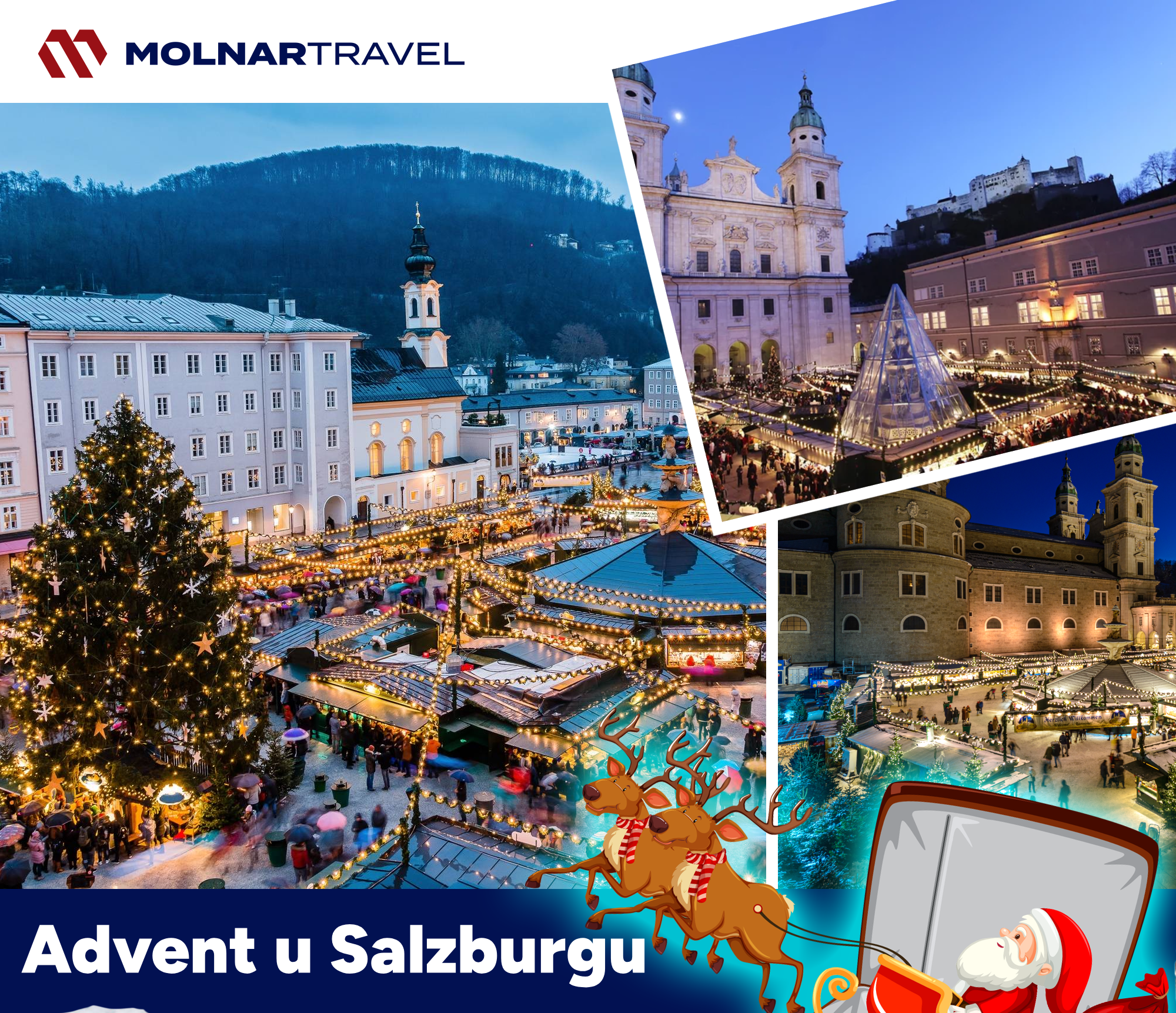 Polazak autobusa u 03:30 sati iz Bjelovara – AUTOBUSNI KOLODVOR. Zagreb u 4:30 sati kod Supernove Buzin. Upoznavanje grupe sa voditeljem putovanja. Slijedi ugodna vožnja kroz Hrvatsku, Sloveniju i Austriju uz usputna zaustavljanja prema potrebi grupe, do MOZARTOVOG grada. Po dolasku u Salzburg, odlazak u razgled grada u pratnji vodiča: POVIJESNA JEZGRA SALZBURGA, BAROKNE GRAĐEVINE, KATEDRALA, CRKVA SV. PETRA, NADBISKUPSKA REZIDENCIJA, MOZARTOV TRG, MOZARTOVA RODNA KUĆA, BAROKNA FONTANA, TORANJ GLOCKENSPIEL… Zajednički odlazak do GRADSKE VIJEĆNICE i božićnog sajma CHRISTKINDLMARKTA. Slobodno vrijeme za kupovinu i uživanje u mnogobrojnim adventskim štandovima. Uživajte u punču, kuhanom vinu, slasticima,… Preporučamo i posjet utvrdi HOHENSALZBURG, jednom od najvećih europskih srednjovjekovnih dvoraca do kojeg možete uspinjačom (uz nadoplatu ). Ne zaboravite kušati i kuglice MIRABELL, s kojih nas promatra omiljeno lice Mozarta i koje su jedan od najprodavanijih austrijskih suvenira. Jeste li znali da je prvu Mozart kuglicu, slatki izum od marcipana, pistacija i čokolade u 19. stoljeću napravio Paul Fürst, no nažalost nije patentirao recept i nije ga nazvao imenom pod kojim je danas poznat – MOZART KUGLICA. No obrt OBITELJI FÜRST i danas nastavlja tradiciju prema originalnoj recepturi te zahvaljujući tome samo u tri salzburške trgovine možete kušati izvorne kuglice koje se izrađuju ručno, u istoj kući u kojoj su proizvedeni prvi primjerci. Kuglice obitelji FÜRST razlikuju se po tome što su veće od Mirabellovih, tvornički rađenih, omotane su srebrnim papirom s plavim Mozartovim likom. Nakon cjelodnevnog uživanja u adventskim programima (posebice onima za najmlađe), degustacije austrijskih specijaliteta i uživanja u Mozart kuglama, slijedi okupljanje grupe u dogovoreno vrijeme i polazak za Zagreb/Bjelovar. Ugodna vožnja kroz Austriju, Sloveniju i Hrvatsku uz usputna zaustavljanja prema potrebi grupe. Dolazak na mjesto polaska u kasnijim večernjim satima.