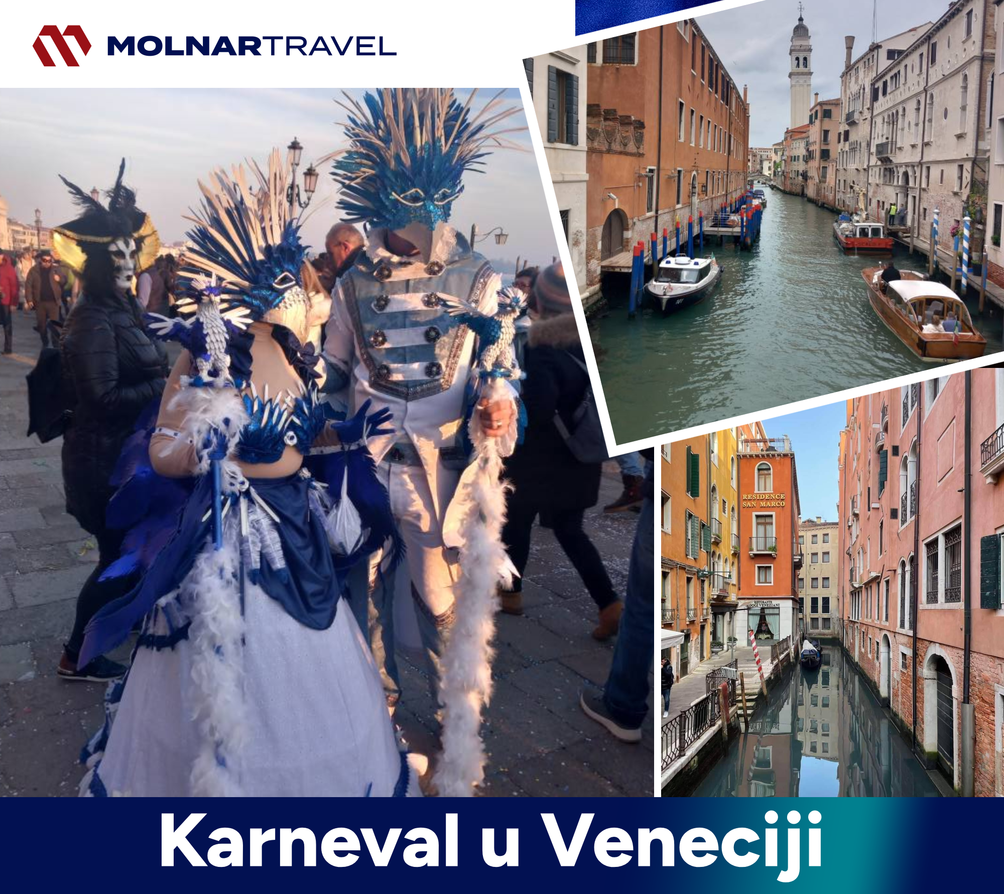 Polazak u 03:15 sati s autobusnog kolodvora u Bjelovaru, iz Zagreba u 04:15h (Supernova Buzin), Karlovac u 05:00h (benzinska postaja KA Petrol), Rijeka u 06:40h ( sjevernog stajališta Vrata Jadrana) . Vožnja autobusom visoke turističke klase kroz Sloveniju i Italiju uz kraća zaustavljanja na putu radi odmora. Dolazak do pristaništa Punta Sabbioni, te vožnja brodićem do Venecije (doplata za brod). Po dolasku razgled grada: KANAL GIUDECCA - RIVA DEGLI SCHIAVONI – MOST UZDAHA - TRG SV. MARKA - DUŽDEVA PALAČA - BAZILIKA SV. MARKA – MOST RIALTO – KANAL GRANDE. Ostatak popodneva slobodno za praćenje najpopularnijeg europskog karnevala koji je tijekom prošlosti bio čarobno mjesto za svakoga i u njega je bio uključen cijeli grad. Razbijao je sva društvena pravila i norme, a prosječnom čovjeku je dao priliku da se izgubi u brojnim bučnim slavljima. Čuveni i tradicionalni Venecijanski festival prvi put je održan još davne 1296. godine! To je bio intenzivan period za Mlečane, gdje bi se uzduž putova ljudi međusobno pozdravljali s „Dobro jutro, gđo. Maska!“, te nije postojao osobni identitet, spol i društvena klasa, bilo je bitno samo sudjelovati u jednoj karnevalskoj iluziji. U 18:30 sati povratak brodićem do Punte Sabbioni, nastavljamo autobusom prema mjestu polaska. Dolazak se očekuje iza ponoći.